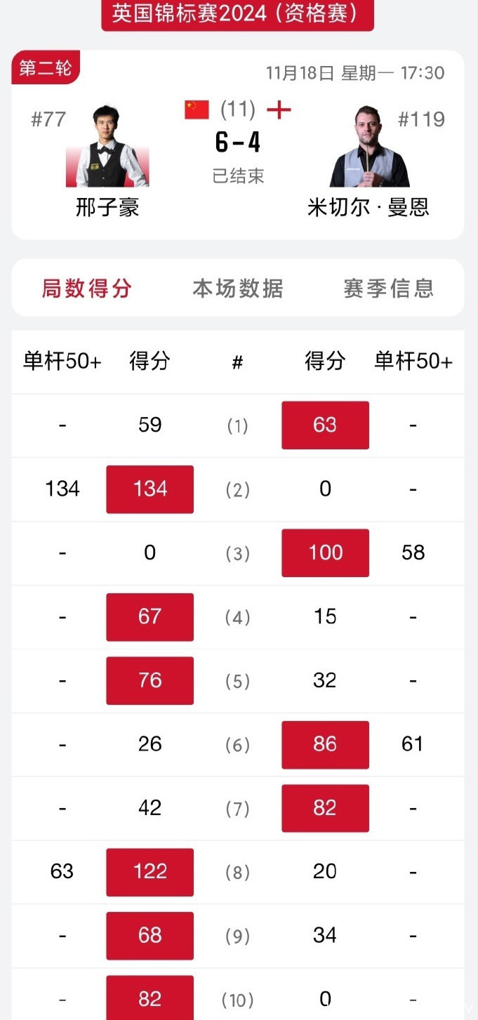 经历赛第二轮,赵心童与白雨露不息强势发力,6-2、6-4得到两连胜。本轮,全国排行第77位的邢子豪迎战米切尔-曼,后者在经历赛第一轮以6-3顺服安德鲁-帕吉特。具体到这场第二轮的比赛中,邢子豪轰出一杆破百此后一杆50+,总比分6-4强势晋级!